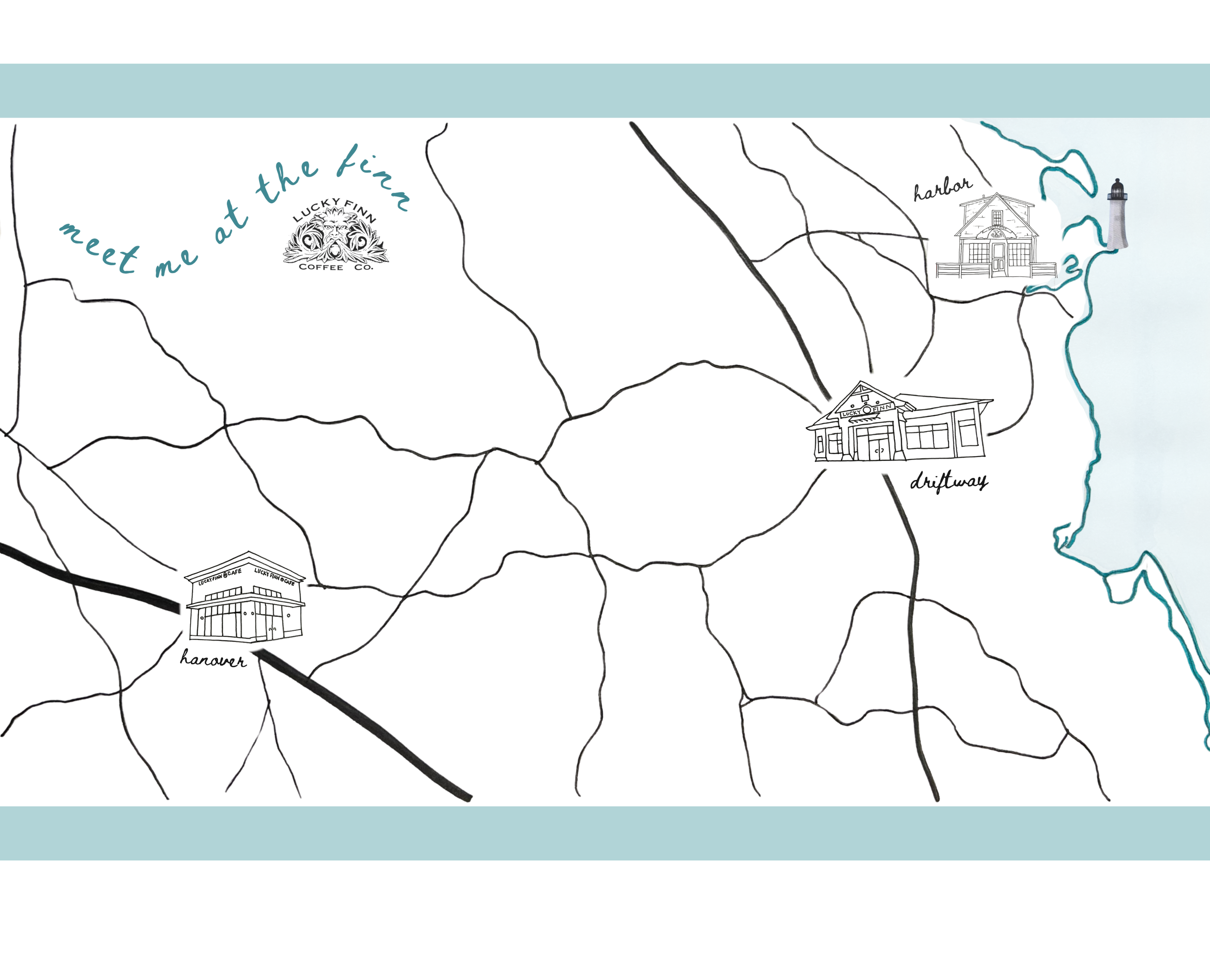 This is a poster I made for a small business. I hand-drew the aerial map of the town and where each location is AND looks like. It is called ‘Lucky Finn’ and is located on the Southern Shore of Massachusetts.