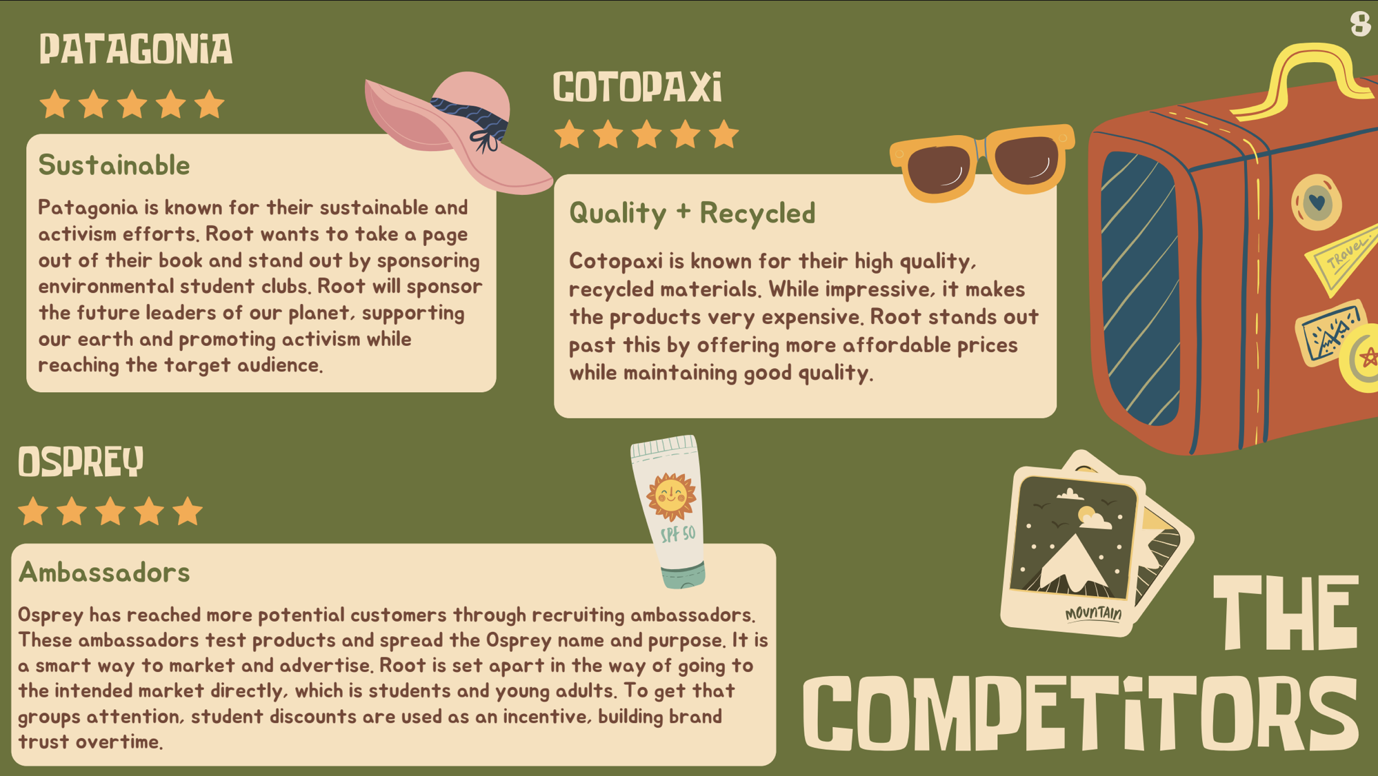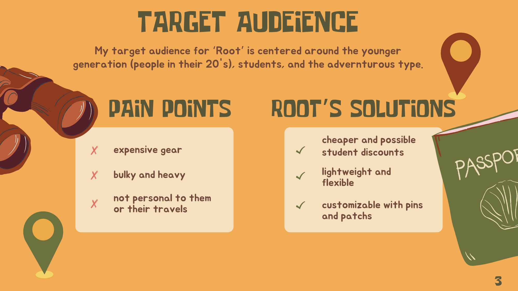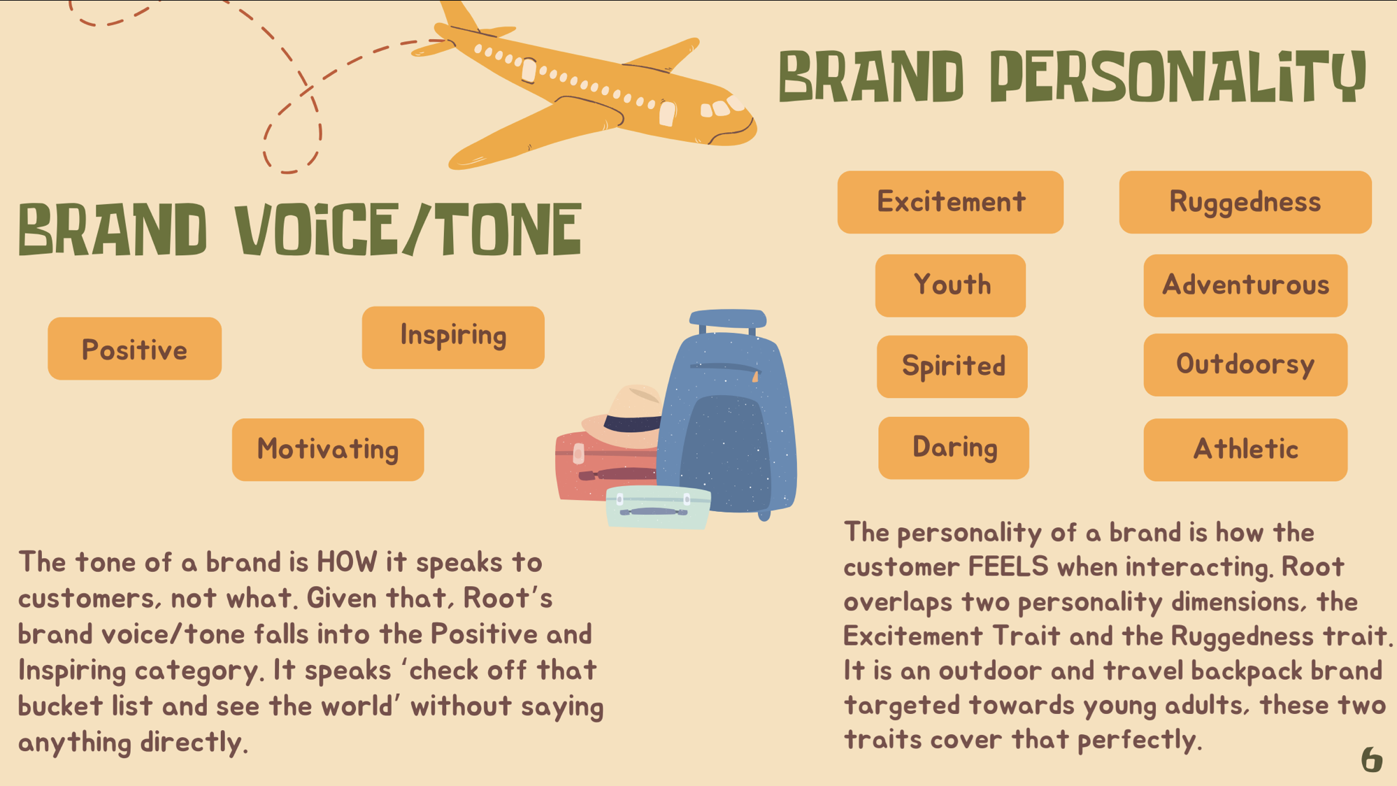 ‘Root’ Michigan State University ADV 224 Brandy Strategy Project We were tasked with creating a brand in its entirety. I was inspired by a travel aesthetic and a warm color palette. This was one of my favorite projects from my time at university.
